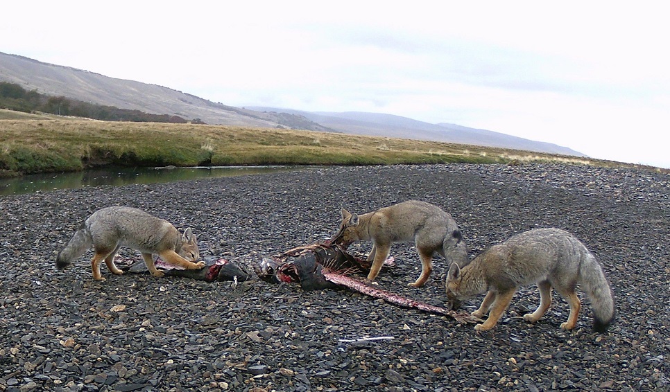 La invasión del salmón Chinook comenzó hace unos 45 años y su impacto principal se da directamente en los ecosistemas fluviales. Este proceso comienza con la alteración de las condiciones del agua a través de la excreción de productos metabólicos y la deposición de huevos. Sin embargo, el fenómeno más significativo ocurre tras el desove. Los salmones son especies semélparas: al igual que el trigo, invierten toda su energía en un único evento reproductivo, y mueren. Este ciclo biológico genera un despliegue masivo de biomasa: “Estamos trabajando junto con ONGs como la Fundación Anfibia, la Secretaría de Pesca de Santa Cruz y APN, con el apoyo de Patagonia CO y en algunos ríos donde realizamos censos con drones estimamos hasta 20 toneladas de carcasas en un sector muy pequeño del río”. Esta enorme cantidad de biomasa es aprovechada por la comunidad de carroñeros para alimentarse, los cuales fueron captados por cámaras trampa colocadas por Ciancio y colaboradores a lo largo del cauce del río para poder estudiar con precisión el comportamiento: “Para entender mejor cómo se alimentan los carroñeros, medimos la biomasa que consumen de cada carcasa pesándola luego de la visita de uno o varios individuos. Además tomamos muestras de distintos tejidos para estimar el aporte en su dieta por parte de los salmones utilizando isótopos estables. Estos actúan como ‘etiquetas químicas’ que nos permiten distinguir si un nutriente proviene del mar (salmón) y qué fracción de la dieta representa. Nos permiten también rastrear el camino de los nutrientes, incluso cuando se diluyen en el agua y son integrados por los productores primarios, llegando finalmente a toda la trama trófica”, completa el investigador del CENPAT.