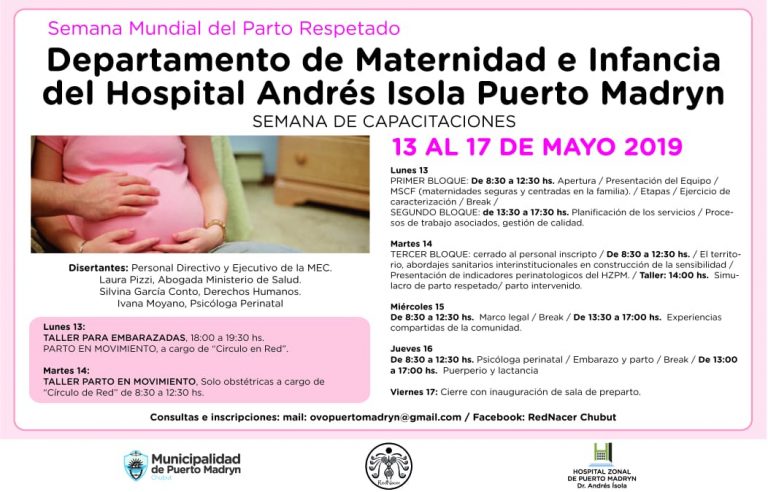 Del lunes 13 al viernes 17 de mayo de 2019 tendrá lugar la agenda de actividades destinadas tanto al equipo de salud como a la población en general. Al respecto Romina Morison detalló que “el día lunes 13 de mayo, a las 18 horas el grupo Circulo en Red dará un taller exclusivo para mujeres embarazadas sobre parto en movimiento con esferodinamia, por su parte el día martes 14 tendrá lugar el curso dirigido específicamente a obstétras, el miércoles 15 habrá una actividad abierta a todo publico donde se abordará la ley y el plan de parto, y el jueves 16 estará dedicado a un taller sobre psicología perinatal destinado a mujeres y publico general que se quiera acercar”